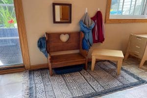 Having a child-size chair is important in supporting their independence. A lot of child furniture is still quite too large for an infant or young toddler. If you are looking for a chair or bench for that 10 to 12-month-old range, you need something with a seat height of about 5 inches. I found this little chair at a garage sale, however, this adjustable chair is another good option. I also like this version, which has easy-to-grab handles.